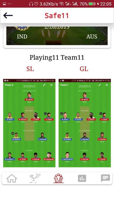 * Safe11: This screen gives best fantasy, Dream11 teams for each match specially for small leagues.