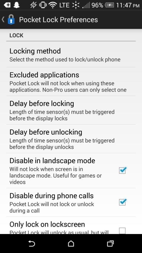 Pocket Lock is easy to set-up and forget, since it starts automatically on boot, but it also offers advanced customization options. The app is completely free and has no ads. If you have any questions, comments, or concerns, use the Send feedback option in the app to email me directly.