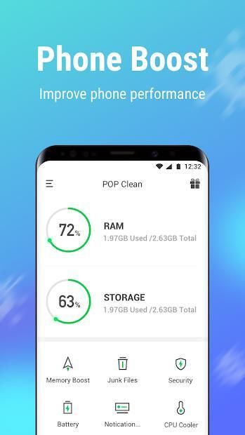 पॉप क्लीन एक हल्का और तेज़ फोन क्लीनर है। कार्यों में जंक क्लीनर, मेमोरी बूस्टर, गेम बूस्टर, ऐप मैनेजर, बैटरी सेवर, सीपीयू कूलर और ऐप लॉकर शामिल हैं।