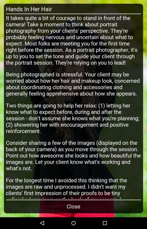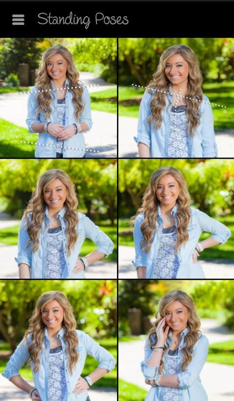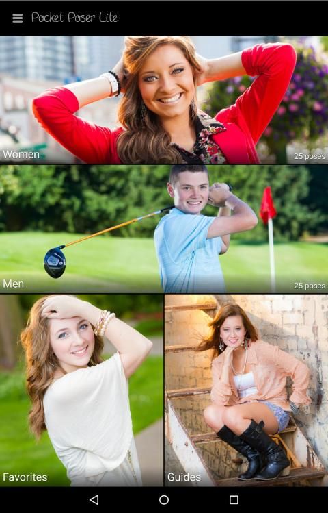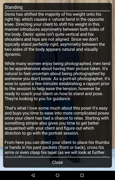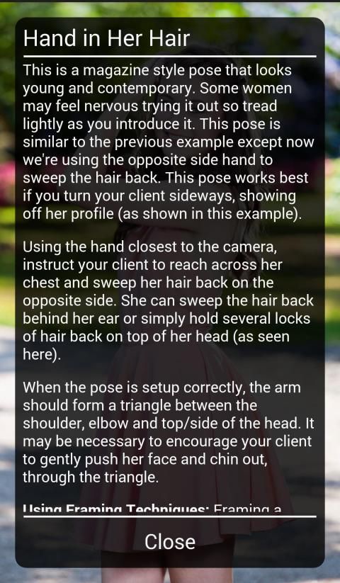 Pocket Poser Lite includes over 50 professional portrait photography poses of men and women. All 50 poses include detailed instructions for setting up each pose. Check out Pocket Poser Pro for over 400 professional poses along with portrait, lighting and posing guides. Pocket Poser Pro is available in the Google Play Store.