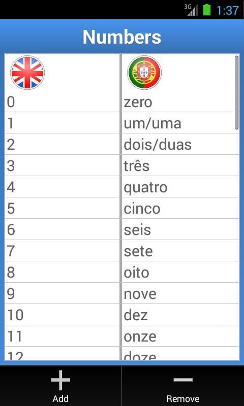 पुर्तगाली जानें और अपने पुर्तगाली शब्दावली में वृद्धि. एक नई भाषा सीखने के लिए या एक विदेशी देश की यात्रा जब उपयोगी सभी मुख्य श्रेणियों में पुर्तगाली से अंग्रेजी से अनुवाद होता है. * सहित: नमस्ते, संख्या, सप्ताह के दिन, माह, लोगों, स्थानों, समय, मौसम, और भी बहुत कुछ.