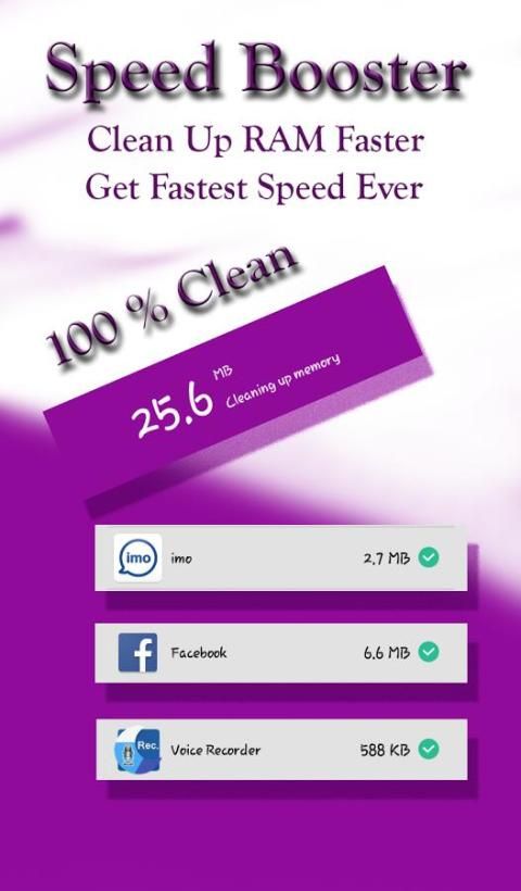 पृष्ठभूमि में चल साफ अनावश्यक एप्लिकेशन द्वारा, इस गति बूस्टर मेमोरी (रैम) को मुक्त कर देते है, और 20% से बैटरी बचाने के लिए। और भी बेहतर, टिकाऊ बढ़ावा प्रभाव सुपर तेज गति में अपने फोन रन रहता है।