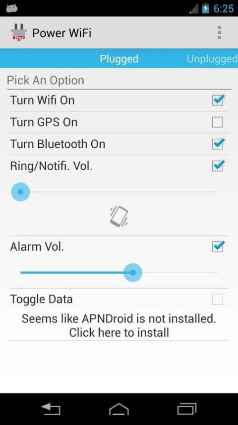 पावर वाईफ़ाई स्वचालित रूप से अपने पसंदीदा सेटिंग्स toggles जब आपके फोन चार्ज करने में चला जाता है. वर्तमान में हम वाईफ़ाई के बदलने की अनुमति देते हैं, ब्लूटूथ, जीपीएस, / अँगूठी अधिसूचना / अलार्म वॉल्यूम, और मोबाइल डेटा.