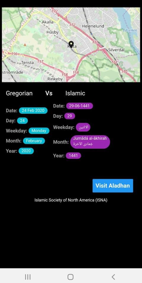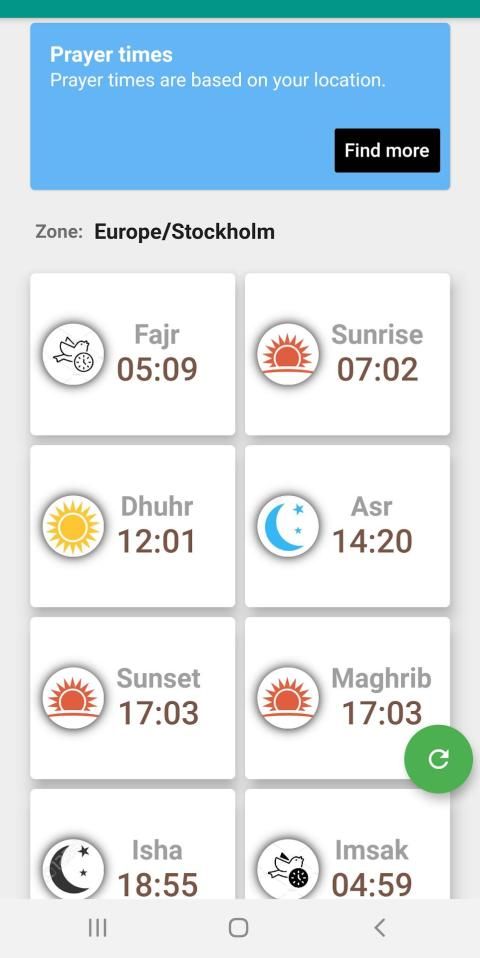 The app is finding your location and based on that you will be able to see the current prayer times. It has some details about both Gregorian and Islamic dates with weekdays etc.