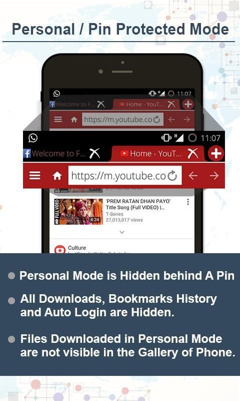 एक दो मोड सार्वजनिक और निजी मोड ब्राउज़िंग के लिए छिपे हुए वेब ब्राउज़र। व्यक्तिगत मोड में सब कुछ पासवर्ड से सुरक्षित है, हर साइटों तुम यात्रा, हर डाउनलोड, सभी वीडियो और छवि है कि आप डाउनलोड की है और देखा पासवर्ड के पीछे बंद कर दिया है। कोई शरीर सकते हैं अपने पासवर्ड के बिना उन्हें देखते हैं।