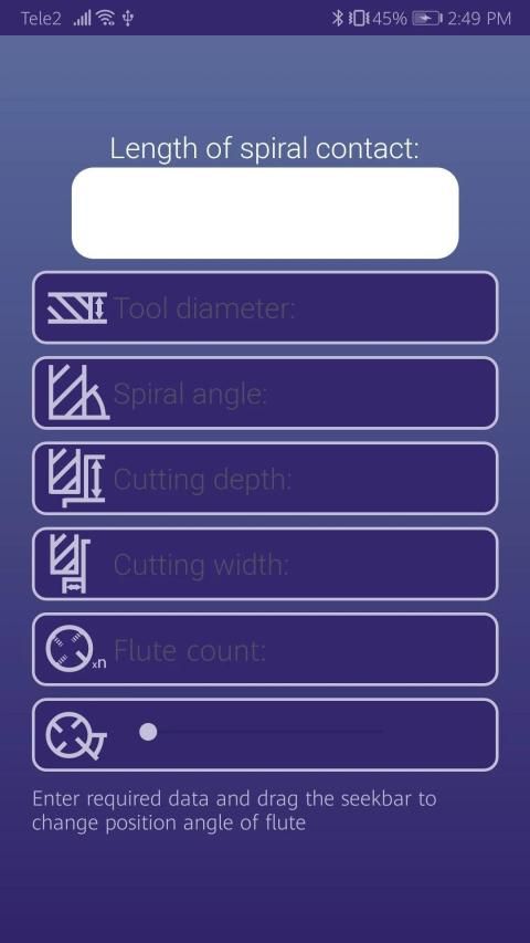 The application allows you to calculate the length of the cutting edge in contact for end mills depending on the parameters of the cutter, cutting width, cutting depth and the angle of rotation of the cutter around its axis.