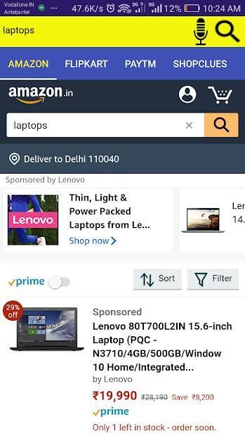 किसी भी उत्पाद के लिए खोज और पर फ्लिपकार्ट, स्नैपडील, Paytm, अमेजन और अलग टैब्स में ShopClues परिणाम मिलता है।