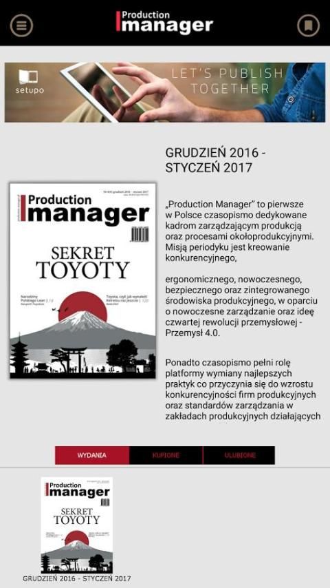 140 से अधिक पृष्ठों के लिए शीर्षक रणनीति प्रबंधन, संगठनात्मक संस्कृति, परिवर्तन प्रबंधन, लागत नीति और कर्मियों, विषय Kaizen, दुबला प्रबंधन, आधुनिक रोबोटिक्स, स्वचालन, स्मार्ट प्रौद्योगिकी, स्मार्ट फैक्टरी, उत्पादन और रसद आपूर्ति श्रृंखला से संबंधित विषयों की पड़ताल। परिसंचरण और पाठकों के मामले में एक विस्तृत श्रृंखला के साथ पत्रिका। यह दूसरों के बीच, है, बिक्री नेटवर्क Empik (अन्य चैनलों में वितरण के लिए छोड़कर - उद्योग सम्मेलनों, निर्माता, prenumeratach, आदि के संघों)।