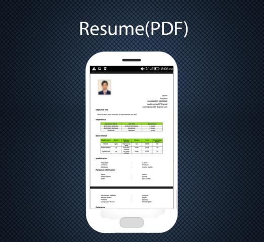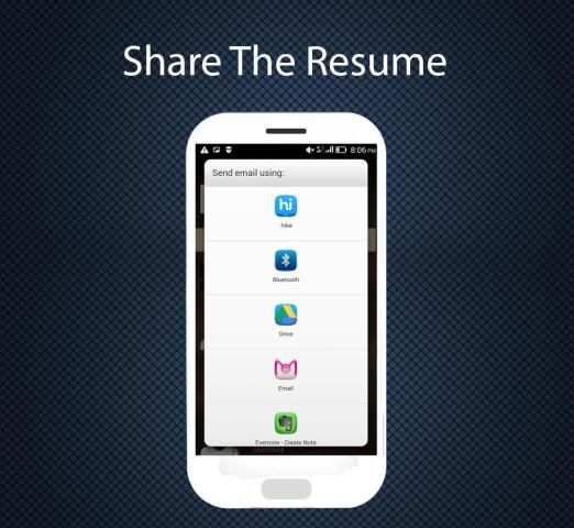 पेशेवर फिर से शुरू निर्माता सिर्फ समय की एक छोटी अवधि में, रचनात्मक शैलियों के साथ अपने फिर से शुरू बनाने के लिए सबसे आसान साधन है। आप पीडीएफ प्रारूप के रूप में अपने को फिर से बचा सकता है और फिर आप ब्लूटूथ, ई-मेल, WhatsApp या किसी भी अन्य सामाजिक साझा मंच का उपयोग कर इन को फिर से शुरू साझा कर सकते हैं।