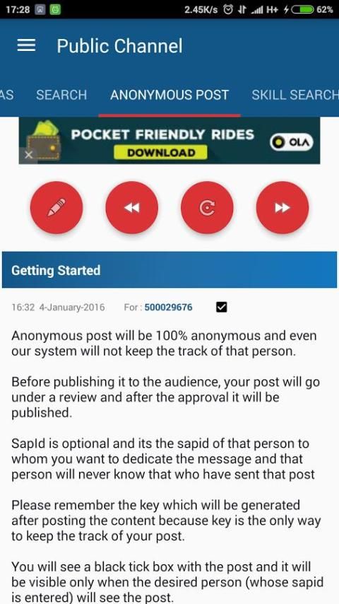 In this app you can post anonymously, and also update your skill profile. Skill search is a feature of searching students on the basis of their skills or talent. You can link your account with Facebook.