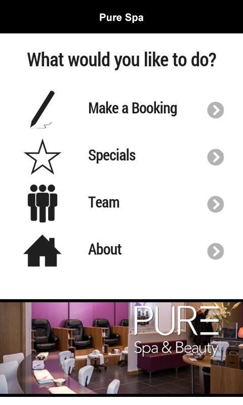 यह इस सरल और इंटरैक्टिव अनुप्रयोग के साथ ग्राहकों के लिए है, की मदद से उन्हें सुंदर लग रहा है और बहुत अच्छी लग रही शुद्ध स्पा एक महान ग्राहक अनुभव प्रदान करता है।