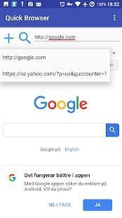 त्वरित ब्राउज़र Android के लिए एक तेज़, आसान और त्वरित ब्राउज़र है। यह आसान सरल और कम से कम सुविधाओं के साथ संभव के रूप में प्रकाश के रूप में करने का इरादा है। सीधे शब्दों में ड्रॉपडाउन सूची में अपने पसंदीदा साइटों नेविगेट या लंबी दोहन से सूची से किसी भी पसंदीदा को हटा दें।