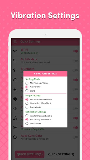 Easy access to control on WiFi, Hotspot, Bluetooth, Auto Sync, GPS(Location), Mobile Data, Ringing, Vibrating, Rotate; to adjust the screen brightness, screen timeout without going to the settings regularly in daily life.