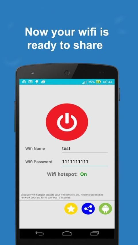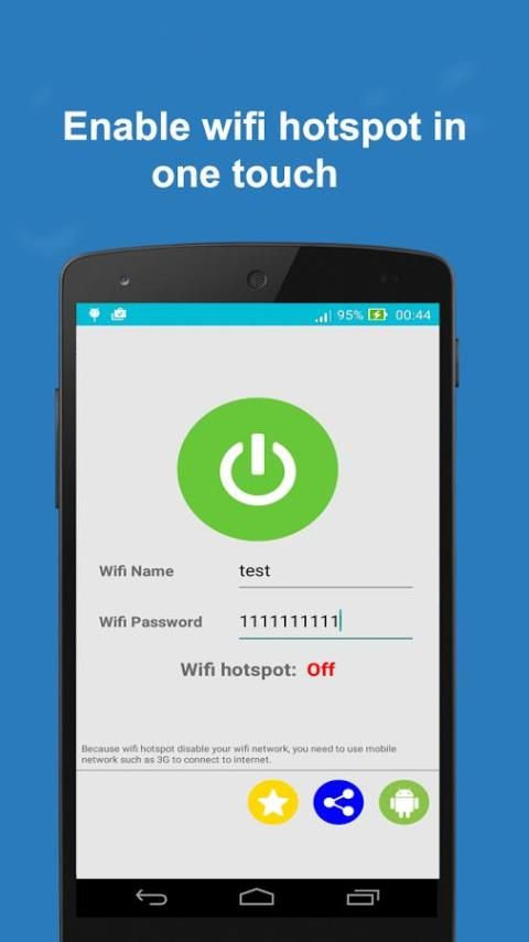 You want to share your wifi network to your friends but it takes many steps to active? No problem, with Quick Wifi Hotspot Tethering, you can enable wifi hotspot tethering, create your own wifi hotspot in one touch. Very simple and easy to use.