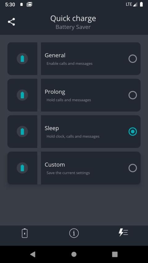 - त्वरित चार्जर उपयोगकर्ताओं को बैटरी पावर (वाईफ़ाई, मोबाइल डेटा, ब्लूटूथ, डेटा सिंक्रनाइज़ेशन, चमक, जीपीएस, ऑडियो, स्क्रीन टाइमआउट) को बचाने के लिए कुछ सिस्टम सेटिंग्स को बंद करने का चयन करने की अनुमति देता है।