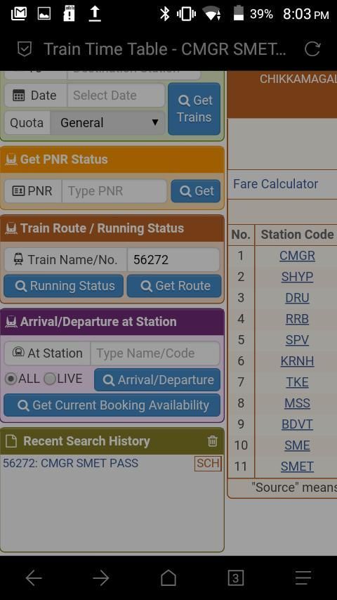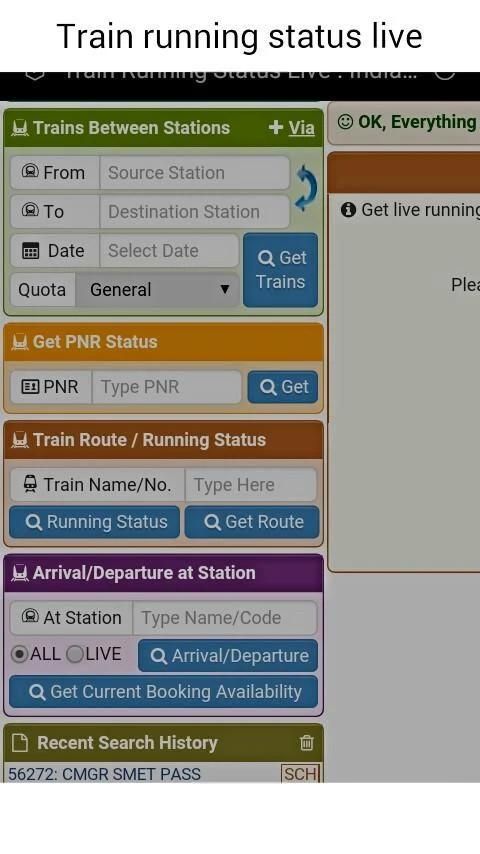 भारतीय रेल आरक्षण पूछताछ, पीएनआर स्थिति, स्थिति रनिंग चल रहा है इतिहास / सांख्यिकी, ट्रेन टाइम टेबल, ट्रेन रूट, रूट का नक्शा, आगमन / प्रस्थान, किराया टेबल, भारतीय रेल