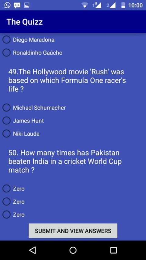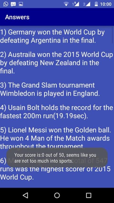 This is a sports quiz app with an interesting twist in the end.The questions cover a wide range of sports. The answers to all the questions have been given in a descriptive manner . You can go through the answers once you are done with the questions. The app will be updated with new sections periodically. We hope you have fun with this version while we try to make this more cooler and more detailed.
