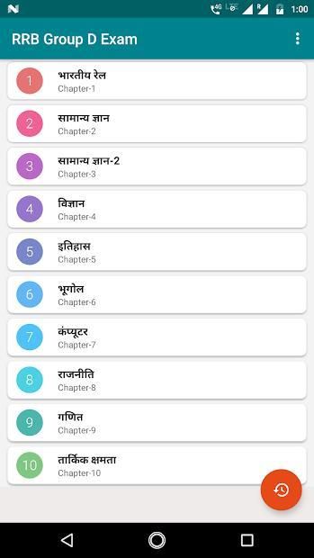 This app is useful for preparation of RRB Group D Exam. This app covers exam syllabus: Mathematics, General Intelligence, General Science and General Knowledge.