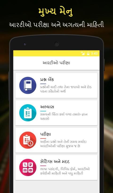 Are you appearing for RTO Exam cum Driving Licence Test in Gujarat and willing to practice before you appear in actual test? Or you’re curious about meaning of road signage and wish to learn more about traffic rules of Gujarat? Or you’re simply looking for RTO Gujarat forms, office address and contact information? Look no further than RTO Exam In Gujarati. This app has been especially created for Gujarat and it offers largest collection of learning licence test questions and answers, road signs and their meaning and other useful information in ગુજરાતી, हिन्दी and English languages.