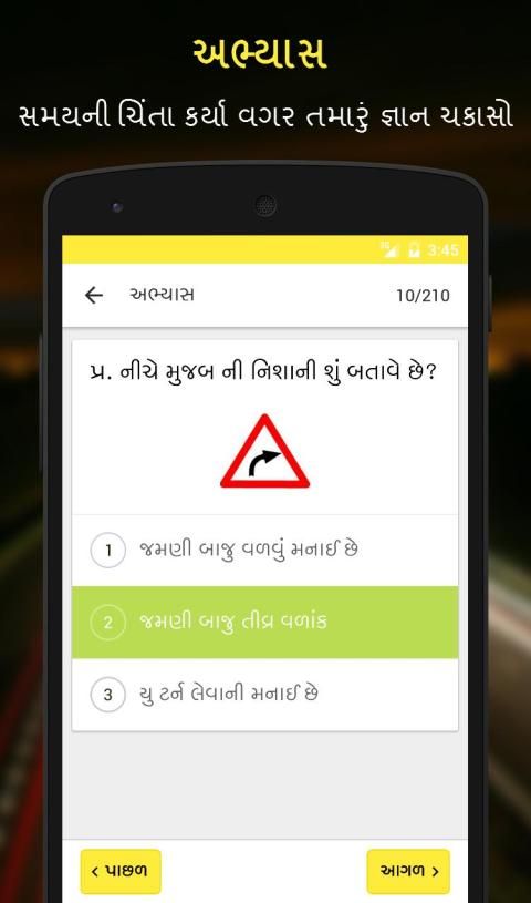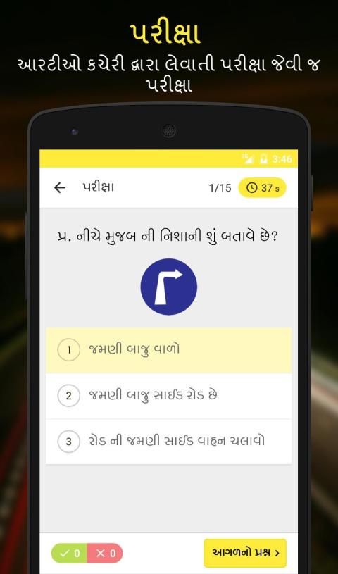 • Time Bound Test: Exactly same as RTO test, random questions and road signs related questions will be asked in this exam. Time limit for each question is exactly same as approved by RTO Gujarat.