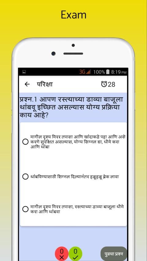 - Exam : Exactly same as RTO test, random questions and road signs related questions will be asked in this exam.Time limit for each question will be 30 seconds(Exam Mode)