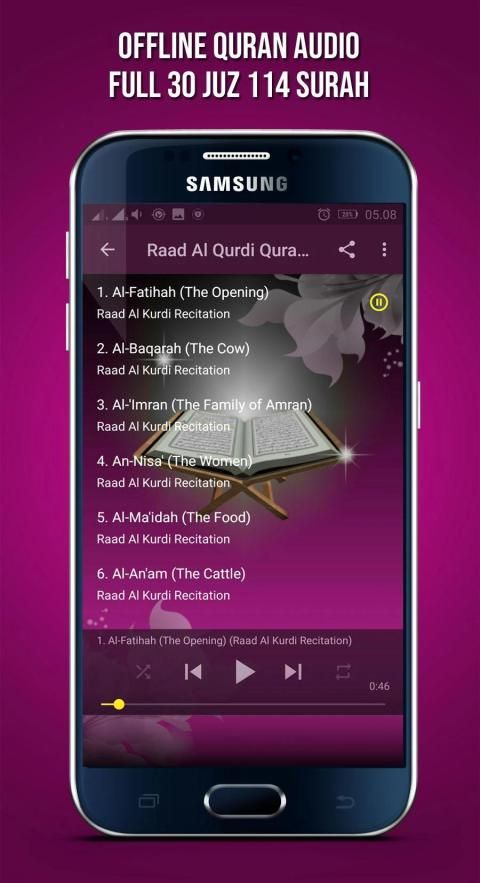Is a quran recitation audio app, reciter by Raad Muhammad Al Kurdi, complete offline 30 juz, 114 surah (including juz amma).