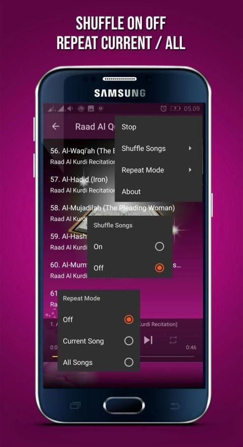 - Shuffle song or Track (play random murottal)