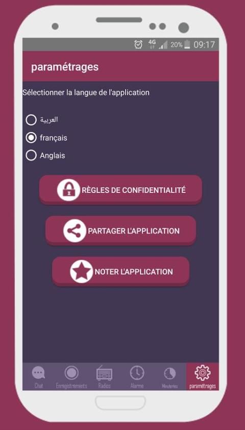 - आवेदन आप के बीच अरबी, फ्रेंच और अंग्रेजी अपनी पसंद की भाषा का चयन करने की अनुमति देता है