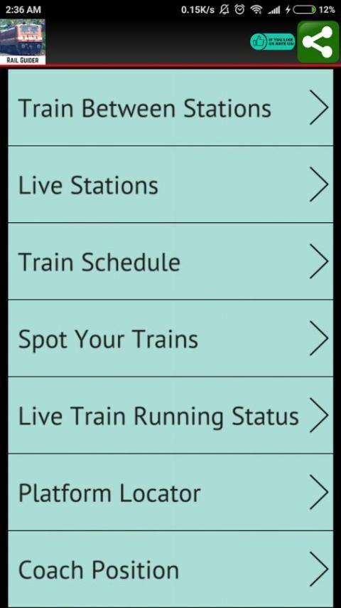 भारतीय रेल एप्लिकेशन 1) पीएनआर की स्थिति और ट्रैकर 2) ट्रेनें खोजें 3) सीट उपलब्धता 4) ट्रेन शेड्यूल 5) ट्रेन लाइव स्थिति 6) आगमन प्रस्थान 7) रेल मार्गों के लिए ऑफ़लाइन जानकारी 8) आसान विकल्प पीएनआर, ट्रेन शेड्यूल तरह की जानकारी को बचाने के लिए है और एसएमएस के माध्यम से अपने दोस्तों के साथ साझा, ईमेल आदि 9) पर गूगल मानचित्र 10) सीट / बर्थ मानचित्र मार्गों देखें