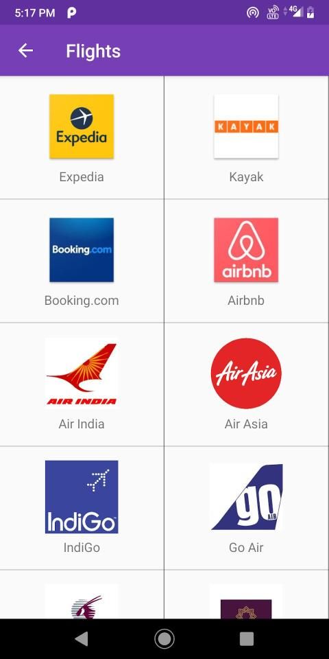 भारत - जेट एयरवेज, फैबहोटल, मेकमाईट्रिप, क्लियरट्रिप, होटल डॉट कॉम, ट्रीबो, आईक्सिगो, ट्रैवलगुरु, रेडबस, बुकिंग.कॉम, ओयो रूम्स, एयरबीएनबी, गोइबिबो (फ्लाइट्स), यात्रा, गोमो, एक्सपीडिया, विस्तारा, स्पाइसजेट, स्काईस्कैनर , मुसाफिर, इंडिगो, एयर इंडिया, गोएयर, ईज़ीमाइट्रिप, कतर एयरवेज, एयरएशिया, गोइबिबो (होटल), हैप्पीसेओ
