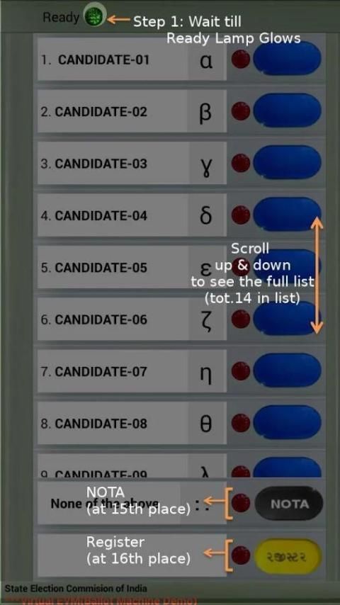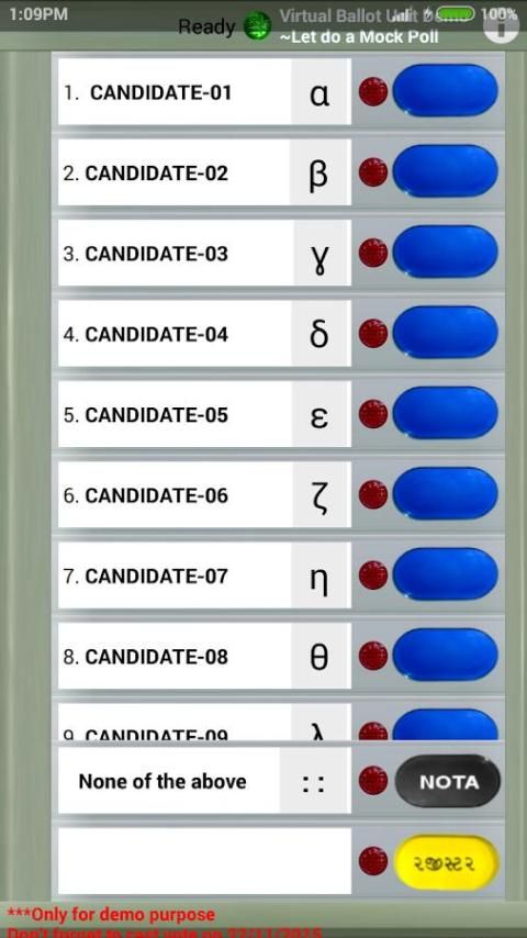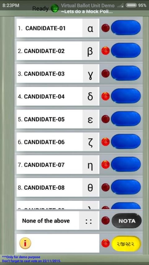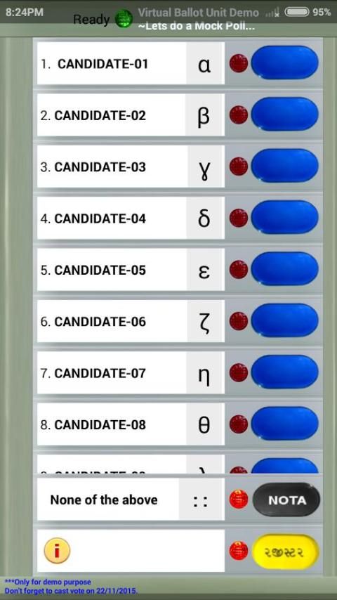This application lets them learn about how EVM machine looks (much in a similar way) and works. Even user may have fun of using this application to play with(esp. beep part I.e. a beep sound that every voters hears after registration). So try Voting to a party that they like with random sequence change and could even opt for NOTA(none of the above) as their choice if he/she doesn't liked any candidates.