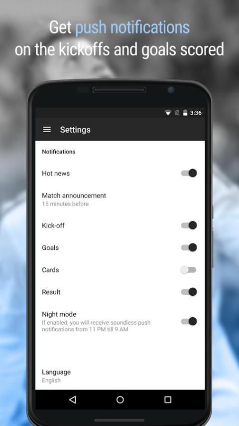 √ किक बंद, गोल, कार्ड और अन्य मुख्य आकर्षण का पुश सूचनाएं।