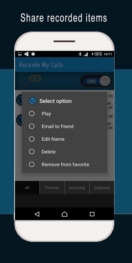 मेरे कॉल रिकॉर्ड अपने सभी कॉल (आने वाली और बाहर जाने वाले) 100% नि: शुल्क रिकॉर्ड करने के लिए एक बहुत ही सरल बुनियादी उद्देश्य है कि एक भयानक मुक्त 2017 app है। यह प्ले स्टोर में सबसे अच्छा कॉल रिकार्डर में से एक है। कृपया गौर किया कि STOCKAGE एंड्रॉयड फोन की कमी के कारण, इस कार्यक्रम केवल माइक्रोफोन से रिकॉर्ड कर सकते हैं। कृपया दूसरी तरफ से स्पष्ट आवाज पाने के लिए बातचीत के दौरान लाउडस्पीकर पर बारी। इसकी एक स्वचालित कॉल रिकॉर्डर आप जहां अपने फ़ाइलों मेमोरी कार्ड या STOCKAGE फोन शेयर करने के लिए चुना जा सकता है। हम कह सकते हैं कि यह सबसे अच्छा आवेदन कॉल रिकॉर्डर 2016 है