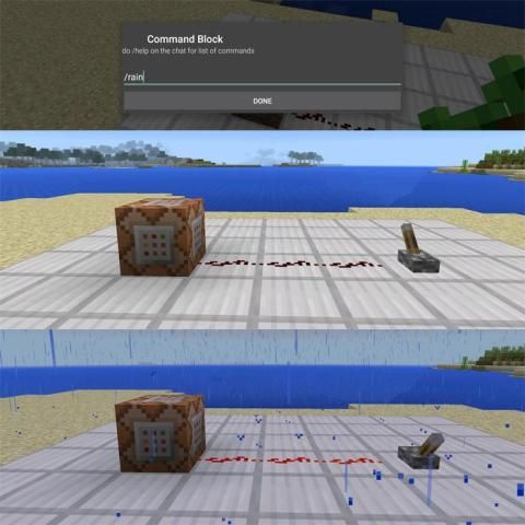 लेकिन जैसे ही हम बारी के रूप में उस पर स्विच बदले में कमांड लाइन पर अमल करेंगे जो आदेश ब्लॉक करने के लिए एक Redstone संकेत भेज देंगे। आप देख सकते हैं और, यह बारिश हो रही है!