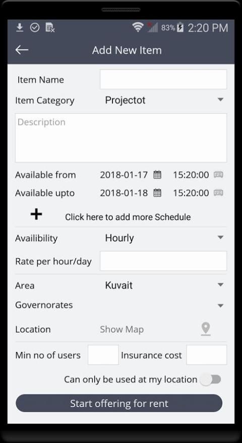 उपलब्ध समय, तिथि, मात्रा, स्थान, विनिर्देशों और मूल्य इसे दूसरों को किराए के लिए: - उन जैसे, उनके उपकरण या सहायता के बारे में जानकारी अपलोड करने शुरू कर सकते हैं।