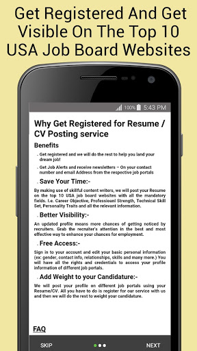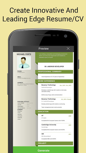 इस एप्लिकेशन के बारे में अनुकूल और फायदेमंद बात यह है कि आप आगे के उपयोग के लिए अपने सभी विवरणों को सहेज सकते हैं, इसलिए आपको हर बार विवरण दर्ज करने की आवश्यकता नहीं है। इस एप्लिकेशन में पीडीएफ दस्तावेज़ के रूप में सहेजने का विकल्प भी शामिल है। एक पेशेवर, उद्योग अनुमोदित फिर से शुरू / सीवी टेम्पलेट्स और अपने वांछनीय नौकरी पर भूमि बनाएं।