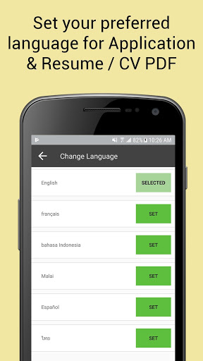 • ऐप और फिर से शुरू / सीवी भाषा चुनें