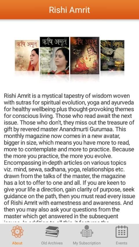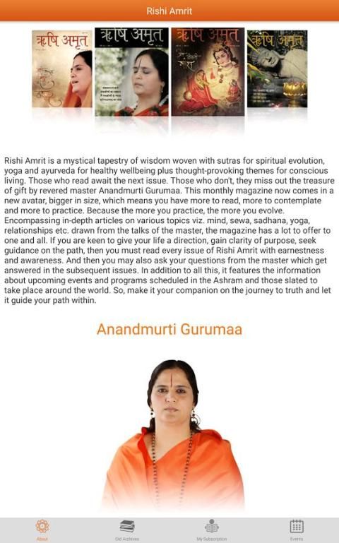 स्वास्थ्य, भलाई और जागरूक रहने के लिए समर्पित, ऋषि अमृत आंतरिक विकास के लिए हर अंक में सोचा उत्तेजक विषय की विशेषता एक मासिक पत्रिका है. अर्थात विभिन्न विषयों पर गहराई लेख में शामिल किया. मन, सेवा, साधना, योग, आयुर्वेद, श्रद्धेय गुरु Anandmurti Gurumaa की वार्ता से तैयार आदि रिश्ते, पत्रिका एक और सभी के लिए एक बहुत की पेशकश की है. आप, उद्देश्य की स्पष्टता हासिल पथ पर मार्गदर्शन की तलाश है, अपने जीवन को एक दिशा देने के लिए उत्सुक हैं, तो आप ईमानदारी और जागरूकता के साथ ऋषि अमृत के हर मुद्दे को पढ़ा होगा. और फिर आप भी बाद के मुद्दों में जवाब मिल जो गुरु से अपने सवाल पूछ सकते हैं. इस सब के अलावा, यह आने वाली घटनाओं एवं कार्यक्रमों आश्रम में अनुसूचित और दुनिया भर में जगह लेने की उम्मीद उन लोगों के बारे में जानकारी सुविधाएँ. इसलिए, यह सच करने के लिए यात्रा पर अपने साथी बनाने के लिए और यह के भीतर अपने पथ गाइड.