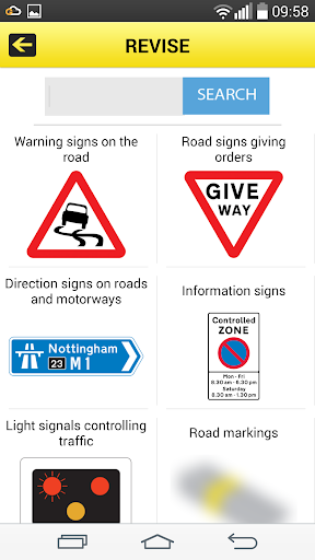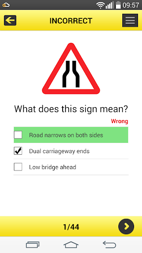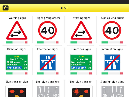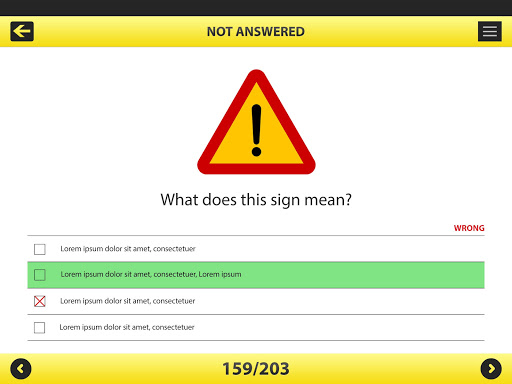 The test informs whether you have made the correct or incorrect choice. You can also categorise test questions to target areas, including warning signs, direction signs, information signs and vehicle markings.
