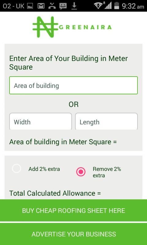 अनुप्रयोग ऑटो छत मीटर sqaure में आवश्यक चादरों की संख्या की गणना करेगा।