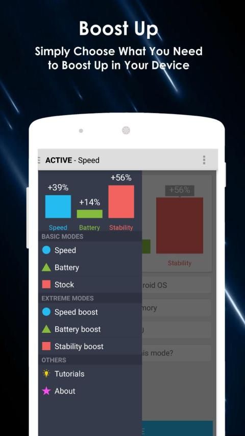 रूट मास्टर आपको चुनने के लिए तीन सेटिंग्स देता है - स्पीड बूस्ट, बैटरी बूस्ट और स्टेबिलिटी बूस्ट। स्पीड बूस्ट के साथ आप गेम खेलने में या आसानी से और बिना अंतराल के उच्च मांग वाले ऐप्स का उपयोग करने के लिए अधिकतम मात्रा में मुफ्त मेमोरी प्राप्त कर सकते हैं।