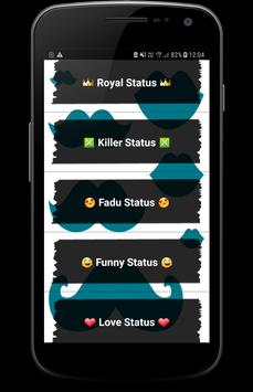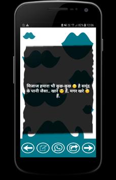 यह ऐप आपको 2019 के लिए हिंदी में सर्वश्रेष्ठ रॉयल एटिट्यूड स्टेटस लाता है। हिंदी में इन रवैये की स्थिति के साथ अपना दृष्टिकोण और व्यक्तित्व दिखाएं। व्हाट्सएप के लिए ये लघु शांत रवैया हिंदी मेसेज हैं जिन्हें एसएमएस के रूप में भेजा जा सकता है या इसे व्हाट्सएप स्टेटस के रूप में सेट किया जा सकता है या इसे नए व्हाट्सएप इमेज स्टेटस के रूप में भी इस्तेमाल किया जा सकता है।