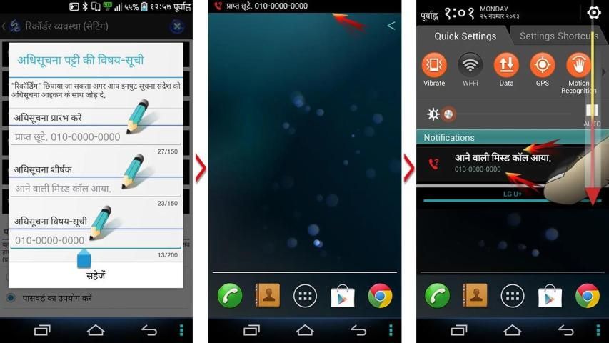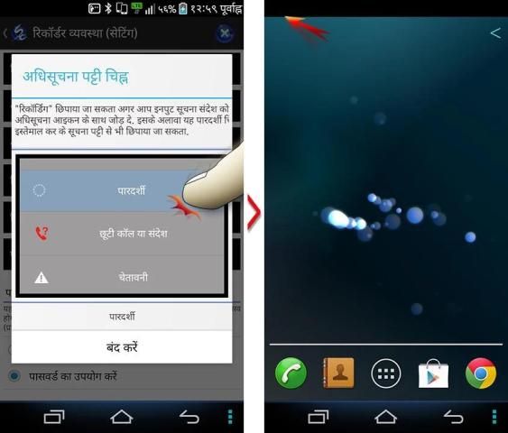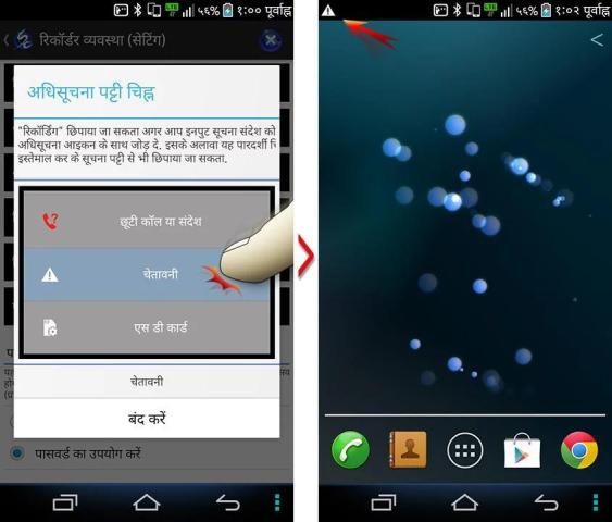 गुप्त रिकॉर्डिंग 20 अधिसूचना चिह्न को बदलकर जैसे फोन कॉल प्राप्त करने, चेतावनी, डाउनलोड, आदि मे उपलब्ध है जो पारदर्शी हैं और सिस्टम का समर्थन योग्य चिह्न हैं. यह सेटिंग के तहत अधिसूचना शुरुआत, अधिसूचना शीर्षक, सूचना संदेश आदि को बदलने मे भी उपलब्ध है.