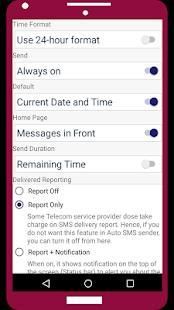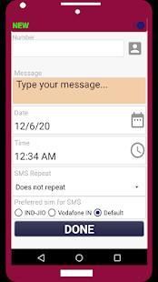 बस तारीख, समय, फोन नंबर और पाठ का चयन करें द्वारा नई समयबद्ध संदेश जोड़ें। आप एक विशिष्ट तिथि पर दैनिक या एक बार एसएमएस भेजने के लिए विकल्प होता है। आप अस्थायी रूप से सक्षम या एक विशिष्ट अनुसूचित एसएमएस या पूरी तरह से अक्षम एसएमएस निष्क्रिय कर सकते हैं।