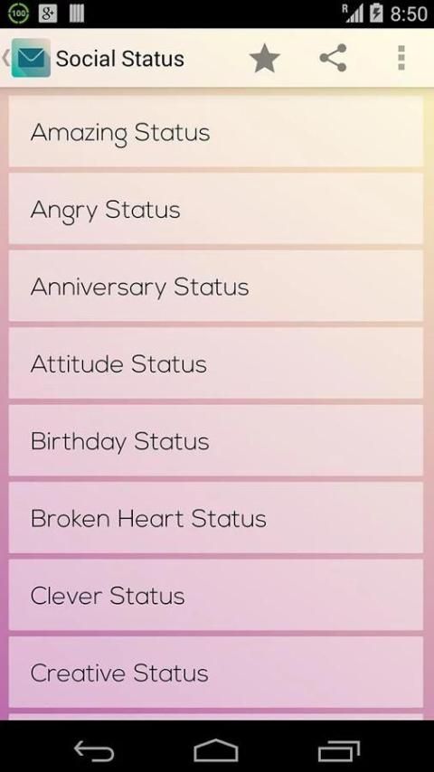 Set your social network status according to your mood & category. Select the category of your choice & explore the best statuses for that category.