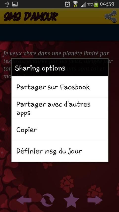 अपनी भावनाओं को व्यक्त करने और अपने प्यार के लिए बहुत नरम फ्रेंच संदेश में थोड़ा प्यार भेजने के लिए इस आवेदन के साथ बहुत आसान हो गया है, अब आप अपने प्रिय के लिए एसएमएस लिखने के लिए, आप बस app खुला है, संदेश भेजने के लिए और किया हॉप चाहते हैं चुनें!
