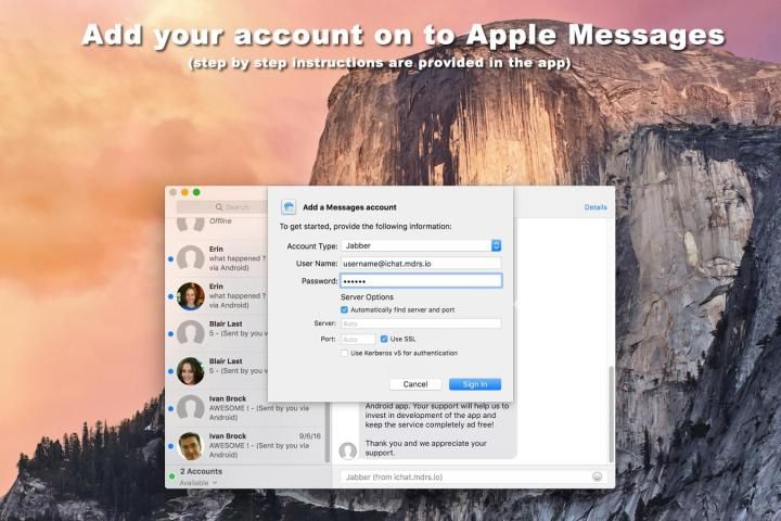 iChat के लिए एसएमएस iMessage (iChat) एप्लिकेशन के माध्यम से MacOS के साथ एंड्रॉयड ग्रंथों एकीकृत करता है।