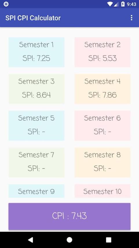 एसपीआई / भाकपा कैलक्यूलेटर एसपीआई (सेमेस्टर प्रदर्शन सूचकांक) की गणना करने और उनकी शिक्षा के पाठ्यक्रम पर सीपीआई (संचयी प्रदर्शन सूचकांक) की एक ट्रैक रखने के लिए छात्रों को मदद मिलती है।