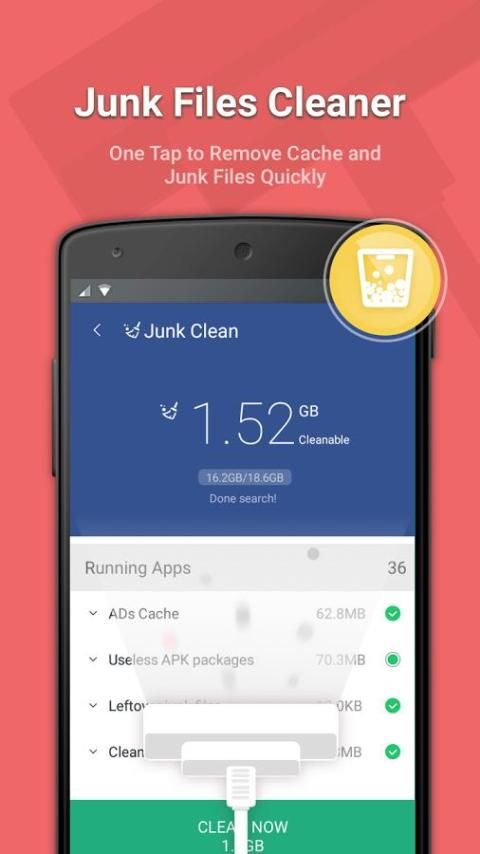 साफ एक नल के लिए और अपने फोन स्मृति का अनुकूलन, बेहतर प्रदर्शन के साथ कार्य कर अपने फोन को मिलता है। एप्लिकेशन को बल समाप्त होने से बैकएंड प्रक्रियाओं में मदद कर सकते हैं। आप हमारे बेहतर फोन अनुकूलन कलन विधि द्वारा एक बढ़ावा बाद एक और अधिक चिकनी ऑनलाइन अनुभव का आनंद जाएगा;