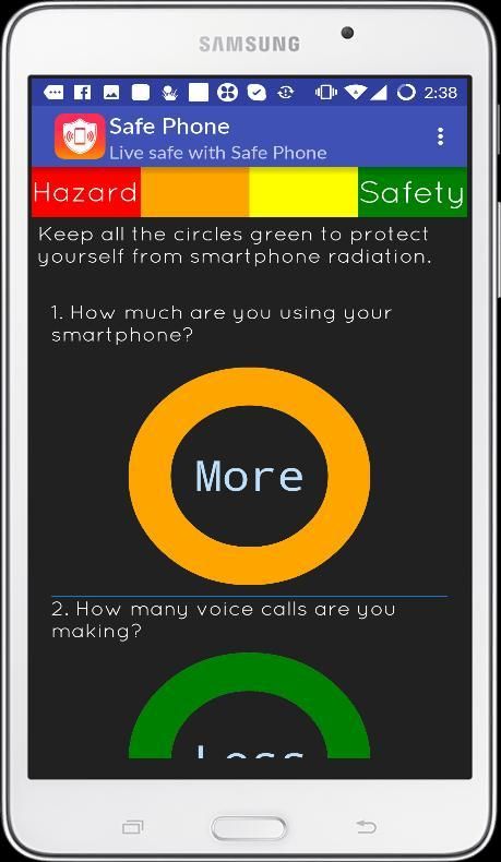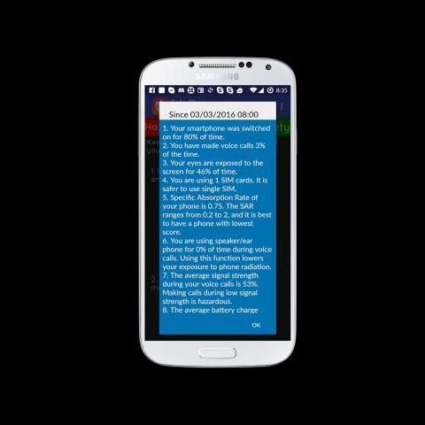 बेहद सफल किताब से प्रेरित होकर, मोबाइल फोन सुरक्षा, सुरक्षित फोन एप्लिकेशन आपके स्मार्टफोन उपयोग हानिकारक विकिरण के लिए जोखिम के अपने जोखिम का निर्धारण करने के लिए पटरियों - यह समय आप, सिग्नल शक्ति के खतरनाक तरीके से कम स्तर के दौरान कॉल करने के इंटरनेट ब्राउज़िंग, या घूर खर्च हो प्रदर्शन पर। 4 रंग ग्रेडेशन के पार - - हलकों है कि लाल (जोखिम) से बदलने के साथ ग्रीन (सुरक्षा) के लिए सुरक्षित, फोन एप्लिकेशन आप गाइड सुनिश्चित करने के लिए कि आप अपने स्मार्टफोन को सुरक्षित रूप से उपयोग कर रहे हैं।